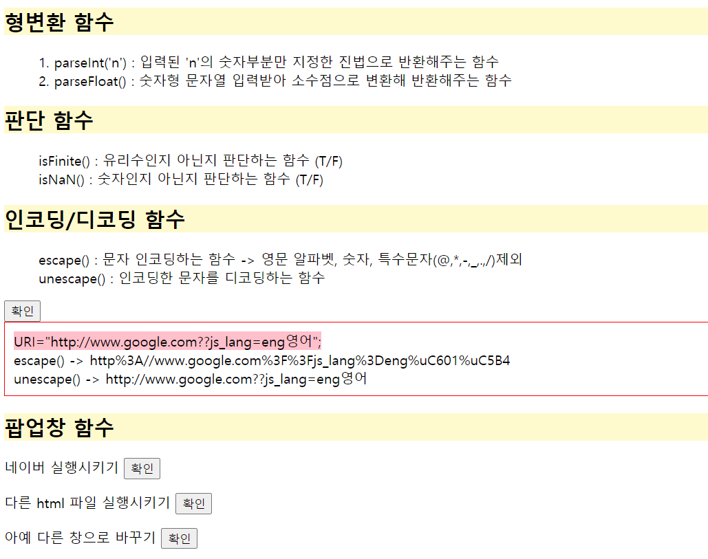 - 형변환 함수/ 유리수 여부, 숫자 여부 판단 함수/인코딩 디코딩 함수/팝업창 함수 에 대해 공부함
