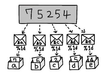 다섯 자리의 정수 1개를 입력받아 각 자리별로 나누어 출력한다.