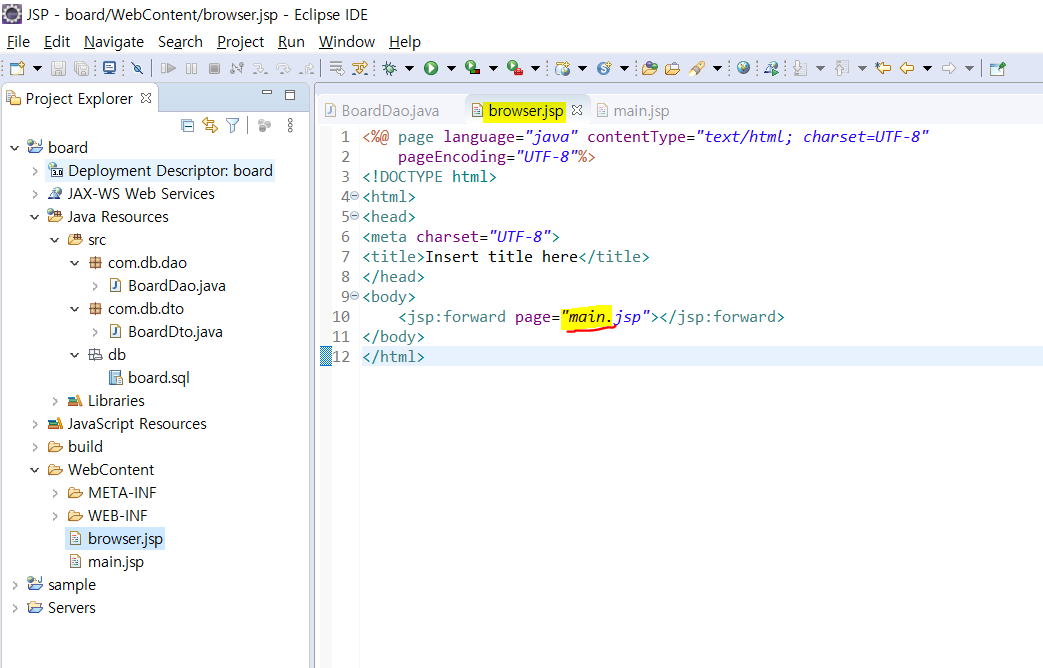 브라우저를 실행할 때 연결해줄 jsp 파일을 적어준다. (main.jsp)