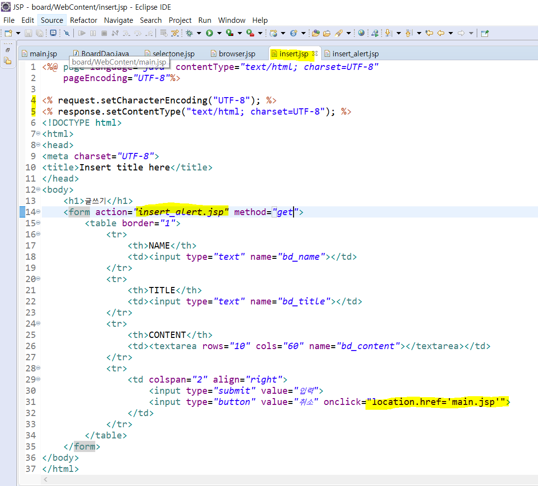 글쓰기 테이블도 만들어준다. 이 insert.jsp의 글쓰기 폼은 insert_alert.jsp로 넘어가게 해준다.