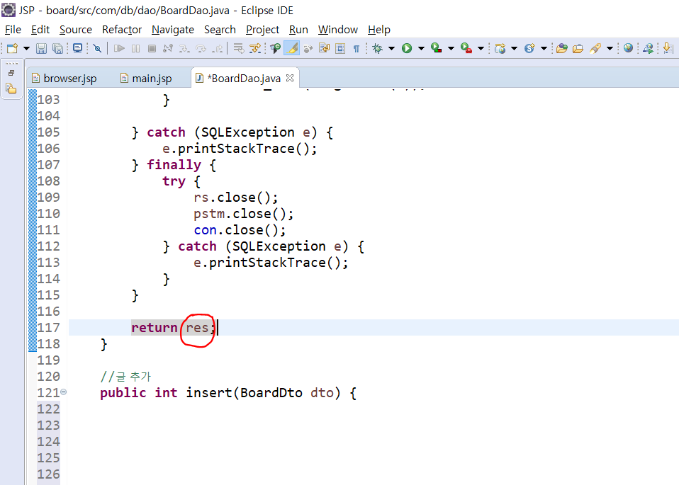 dao에서 담아온 res로 글이 잘 등록됐는지 안됐는지 확인해보고 잘 됐다면 등록 후 main.jsp로 이동하고 안됐다면 insert.jsp에 머무르게 한다.