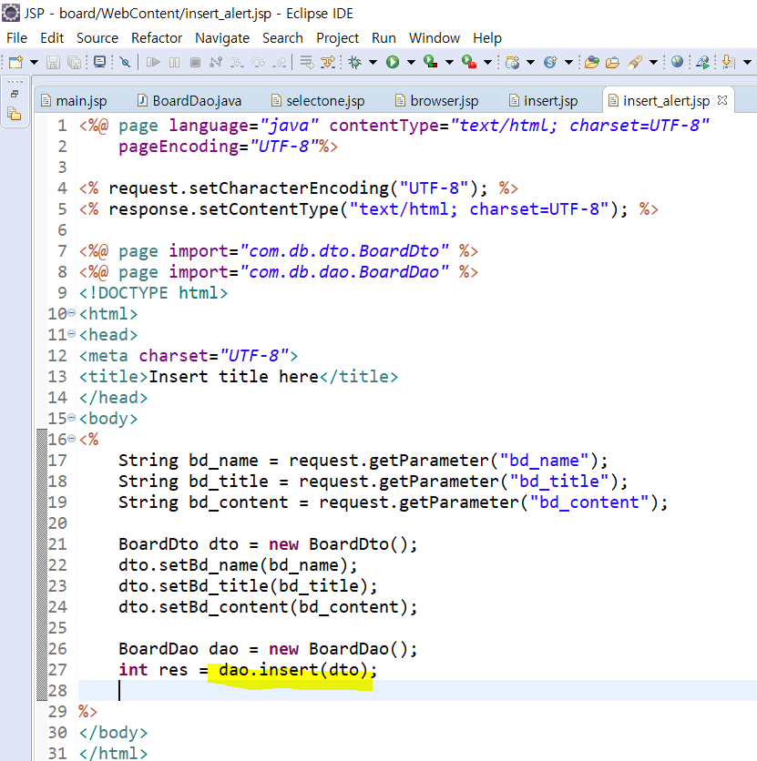+BoardDao.java로 넘어가 insert 메소드를 완성해준다.