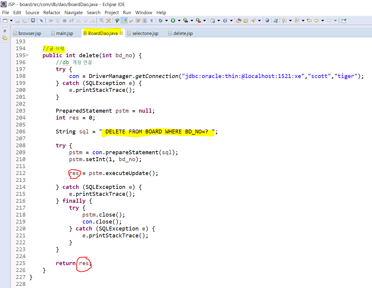 +BoardDao.java에서 delete메소드를 완성해준다.
