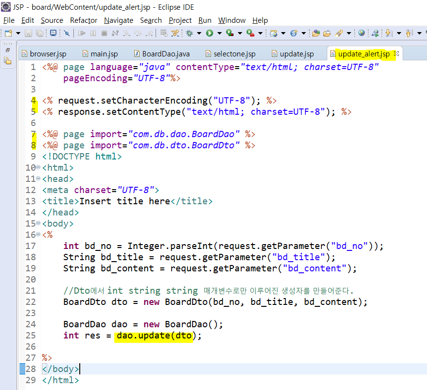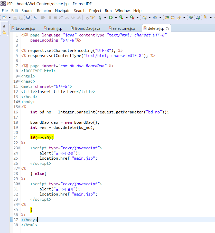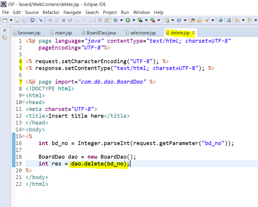 delete.jsp는 4.5.에 UTF-8을 7.에 import를 해주고 dao에서 delete(bd_no) 메소드를 사용한다.
