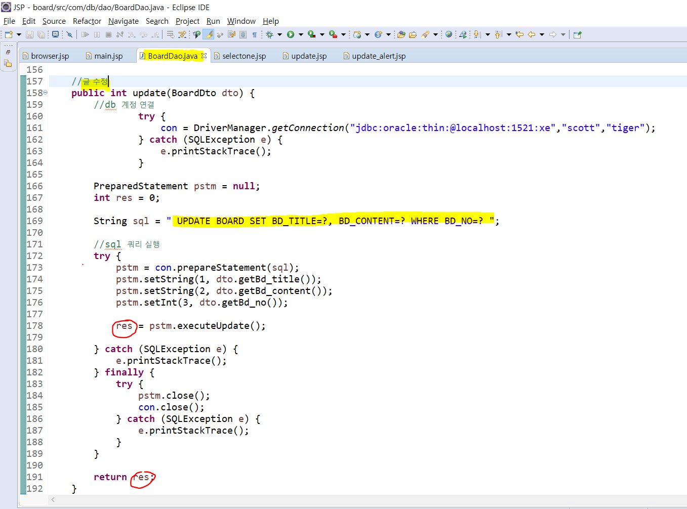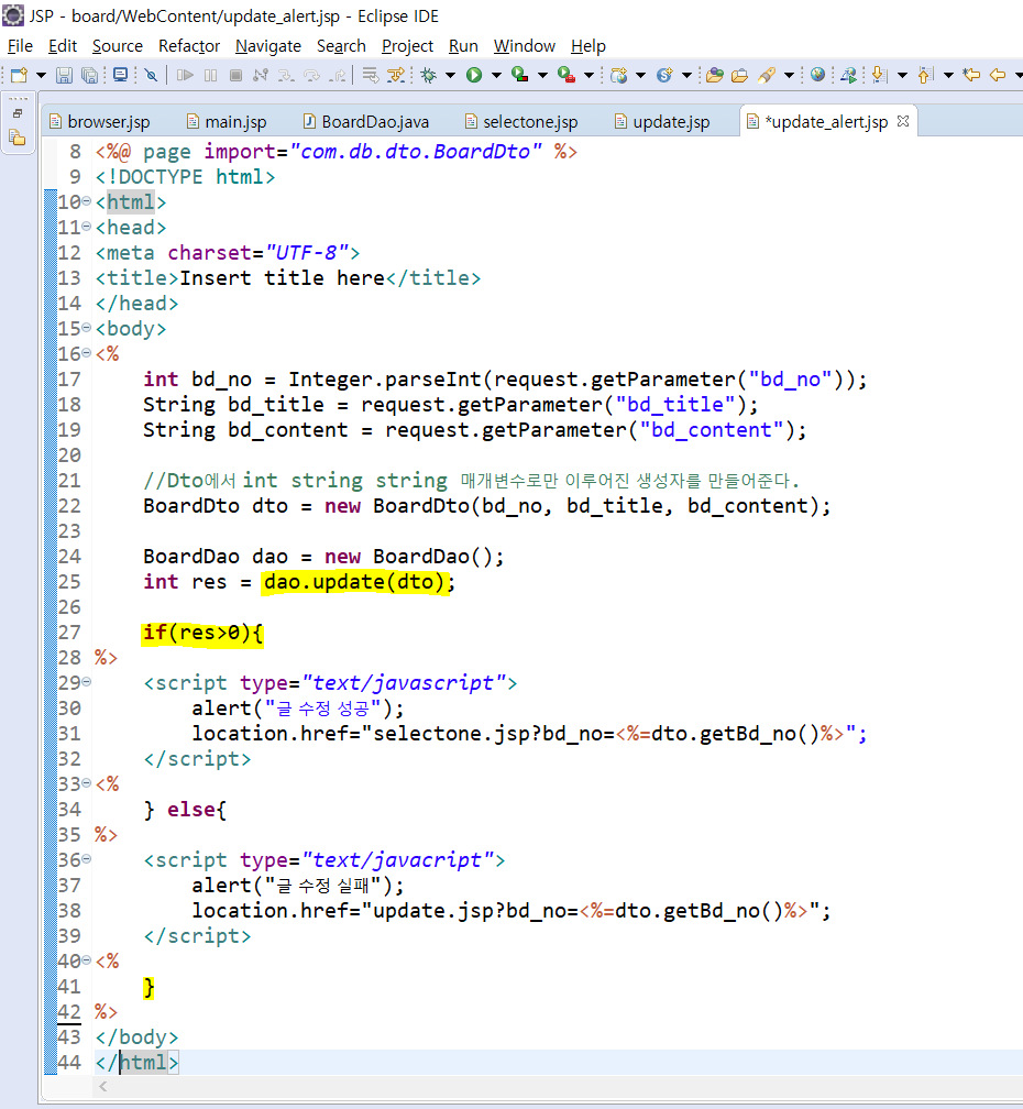 update_alert.jsp로 넘어가 update 메소드를 실행시키고 글이 수정될 때, 안될때 동작 기능을 추가해준다.