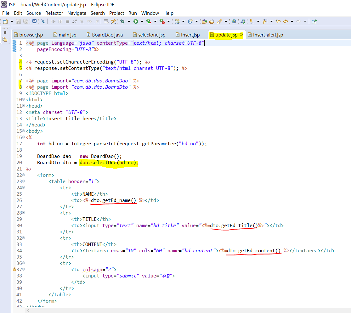 update.jsp는 dao에서 게시글 하나를 가져와서 수정하는 것으로 일단 선택한 번호에 따른 데이터를 가져온다.