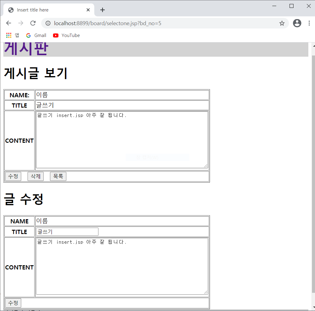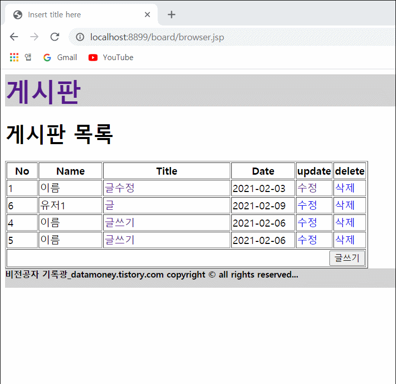 2021/02/07 - [IT 독학/WEB] - [JSP ⑤] JSP 실습 - CRUD게시판 구현하기 ( U D 기능 구현 / 백엔드 / 웹개발 기초 / 웹개발 독학 )
