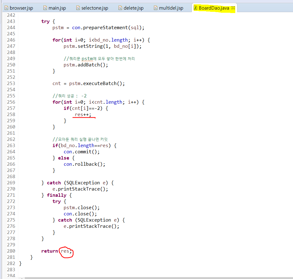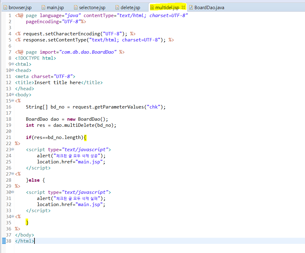 main.jsp와 연결된 multidel.jsp는 체크 여부를 가져오고 dao의 multiDelete( )메소드를 통해 삭제되도록 해준다.