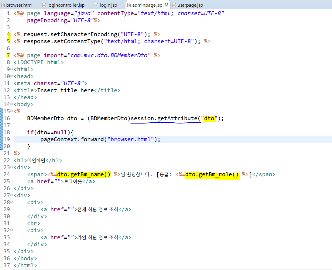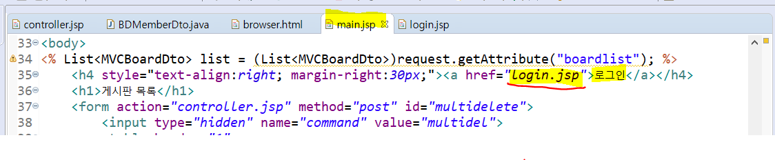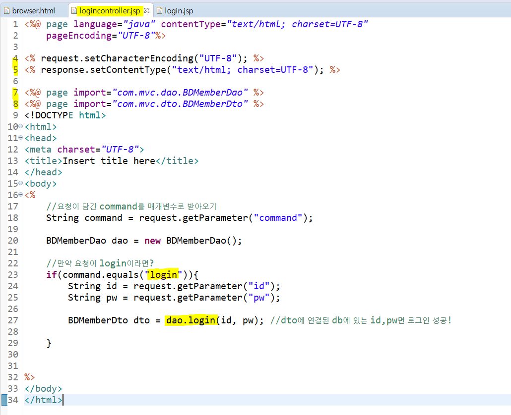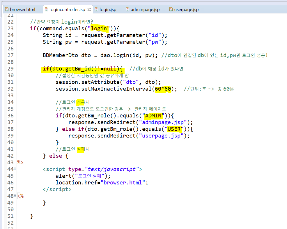 이제 다시 logincontroller.jsp로 넘어가 요청 처리를 마무리해준다.