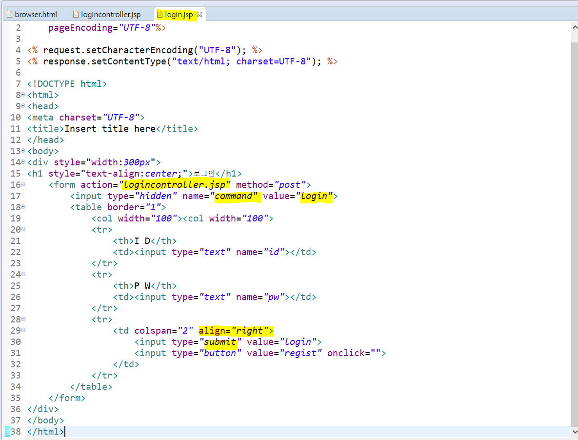 다시 login.jsp로 가서 submit을 누를시 logincontroller.jsp로 넘어가고 요청은 login으로 넘겨주기로 한다.