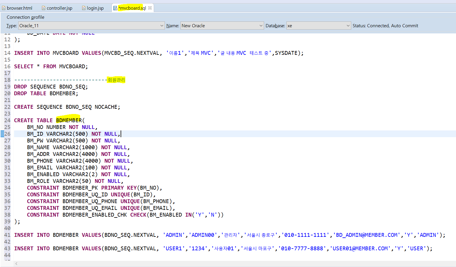 select * from bdmember; 를 해줘서 잘 생성+입력됐는지 확인하고 넘어간다.