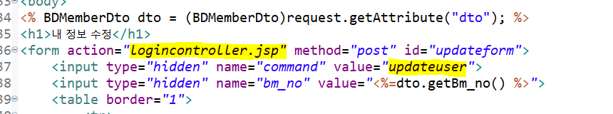 그리고 submit 버튼을 누르면 logincontroller.jsp에 updateuser 요청을 넘겨준다.