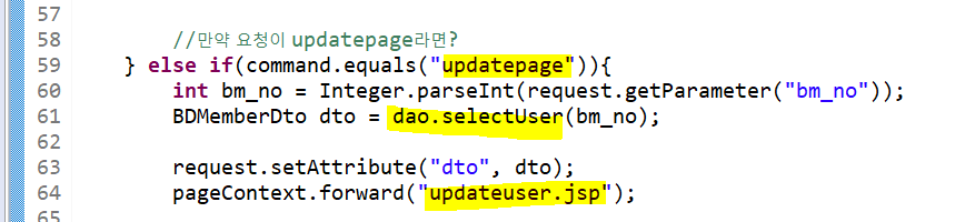 단순 정보 조회처럼 dto를 가져와 updateuser.jsp로 넘겨준다.