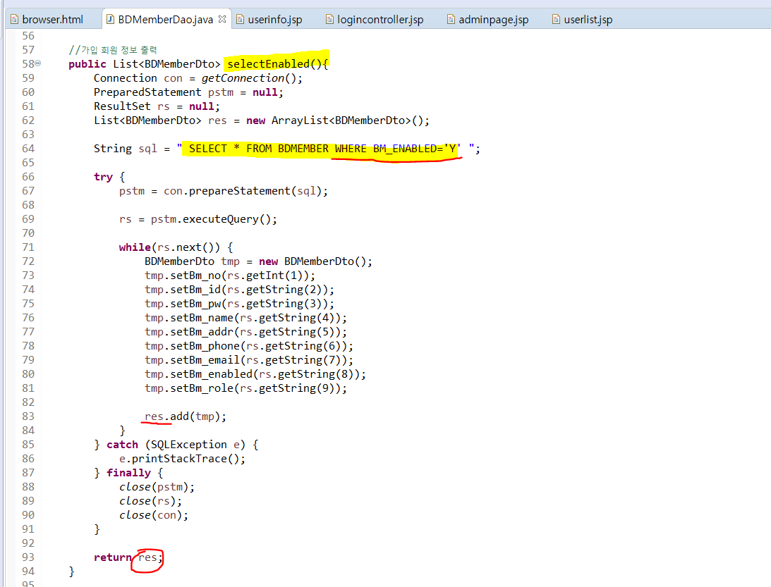 가입 회원 정보 조회 userlistenabled 도 logincontroller.jsp에서 잘 받아주고 dao의 selectEnabled( ) 메소드를 완성해준다.