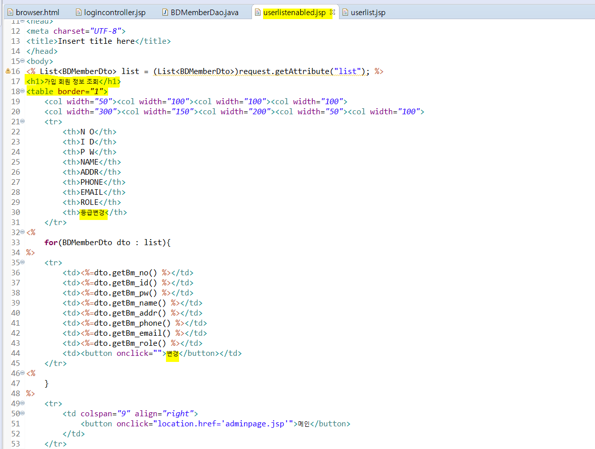 다시 logincontroller.jsp로 돌아와 리턴된 list과 함께 그대로 userlistenabled.jsp로 넘겨준다.