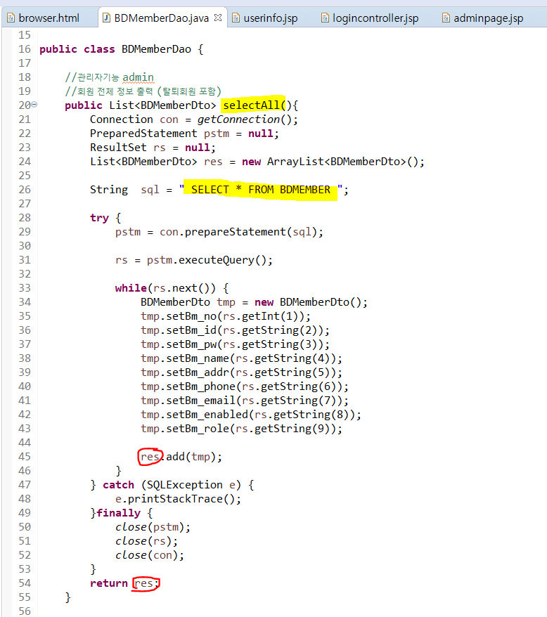 dao에서 selectAll( )메소드를 완성해준다.