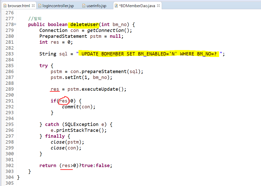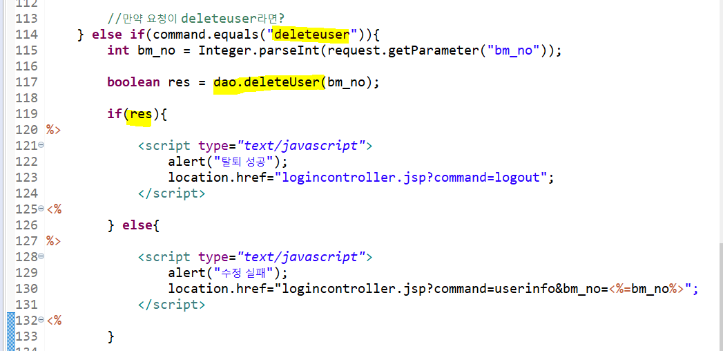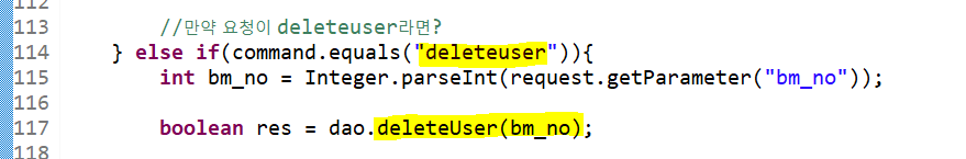 logincontroller.jsp로 deleteuser 요청을 받아주고 bm_no도 같이 받아준다.