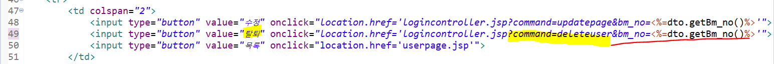 userinfo에서 탈퇴버튼을 누르면 logincontroller.jsp로 deleteuser 요청을 넘겨준다.