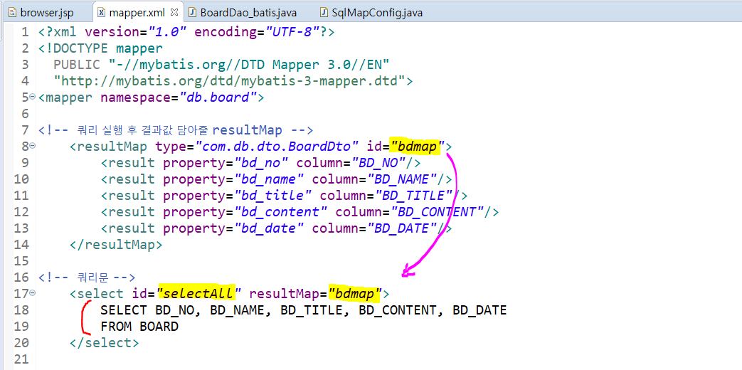 결과는 resultMap타입으로 위에 적어준 bdmap 으로 반환해준다고 적는다.