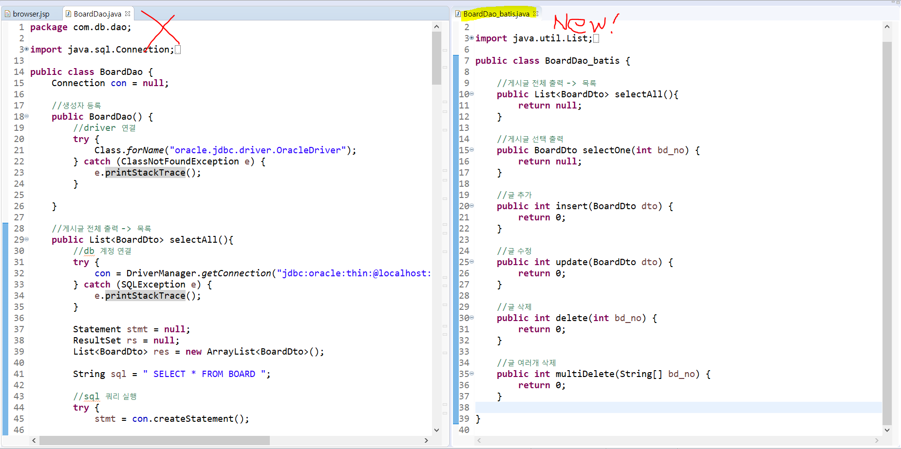 JDBC를 이용한 dao는 지워버리고 새로운 batis버전의 dao를 만들어줬다.