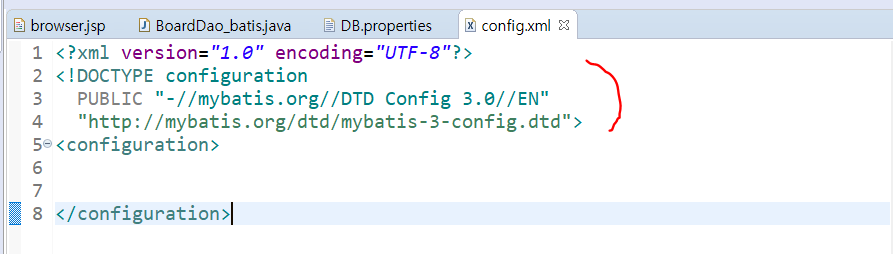 일단 이 xml 파일이 mybatis의 설정임을 선언해주고
