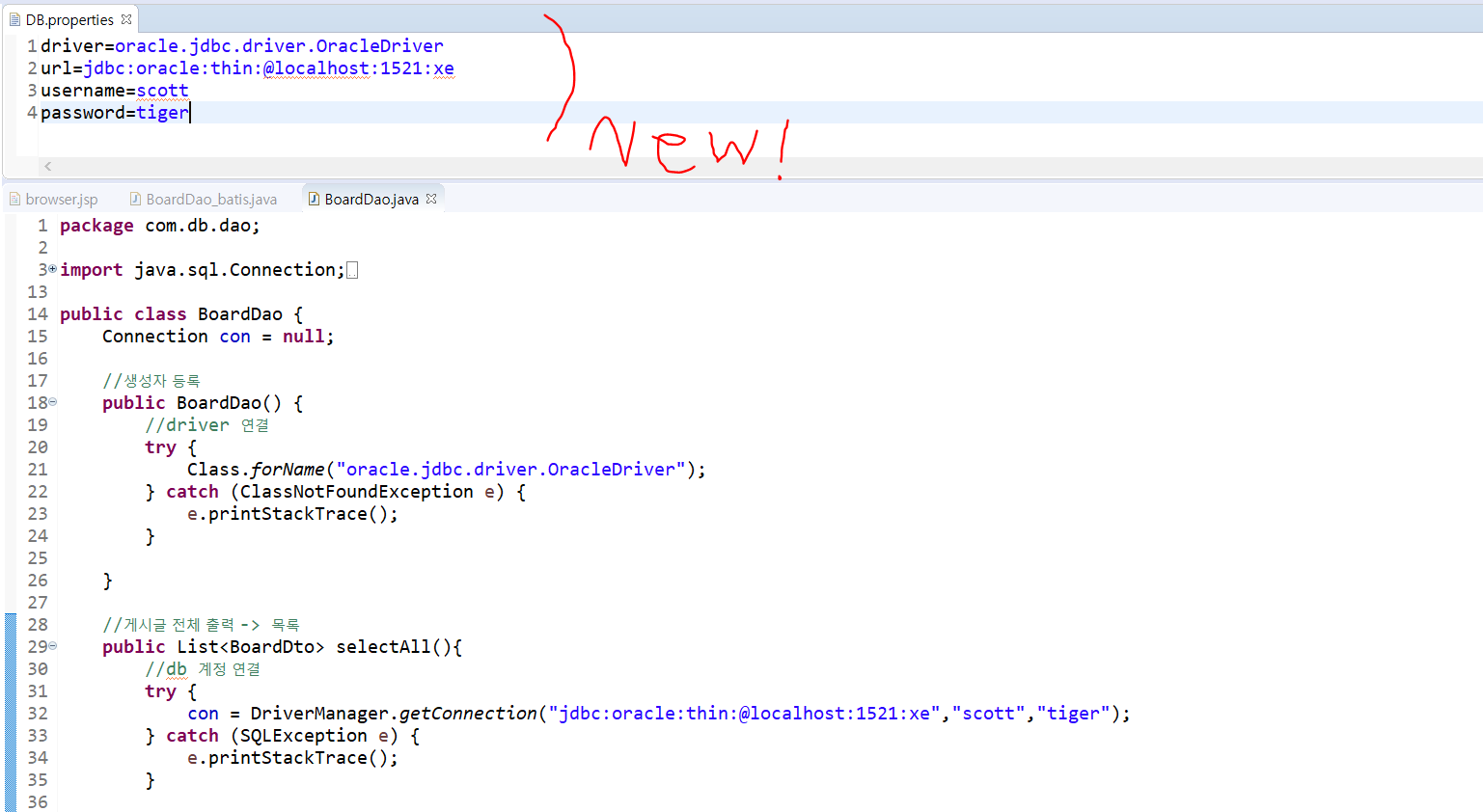 밑에는 JDBC를 사용한 Dao다. 이처럼 Dao에서 driver을 연결하고 계정 연결을 해주고 이런 과정을 해줄 필요가 없어진 것이다.