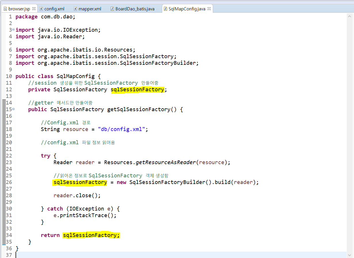 session 객체 생성을 위해 sqlsessionfactory를 만들어주고 config.xml 의 정보를 읽어와 만들어준 session에 내용을 담아준다.