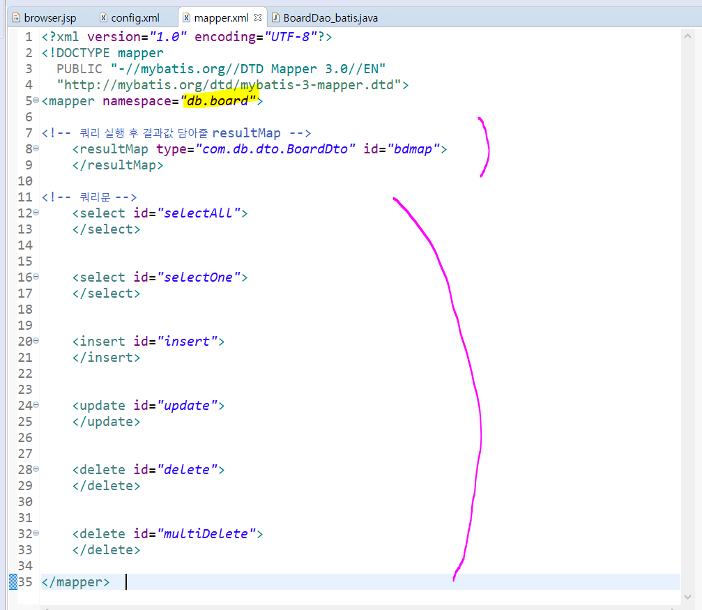 이 xml 이 mapper 설정임을 선언해주고 <mapper> 안에 쿼리문을 작성해주면 된다.