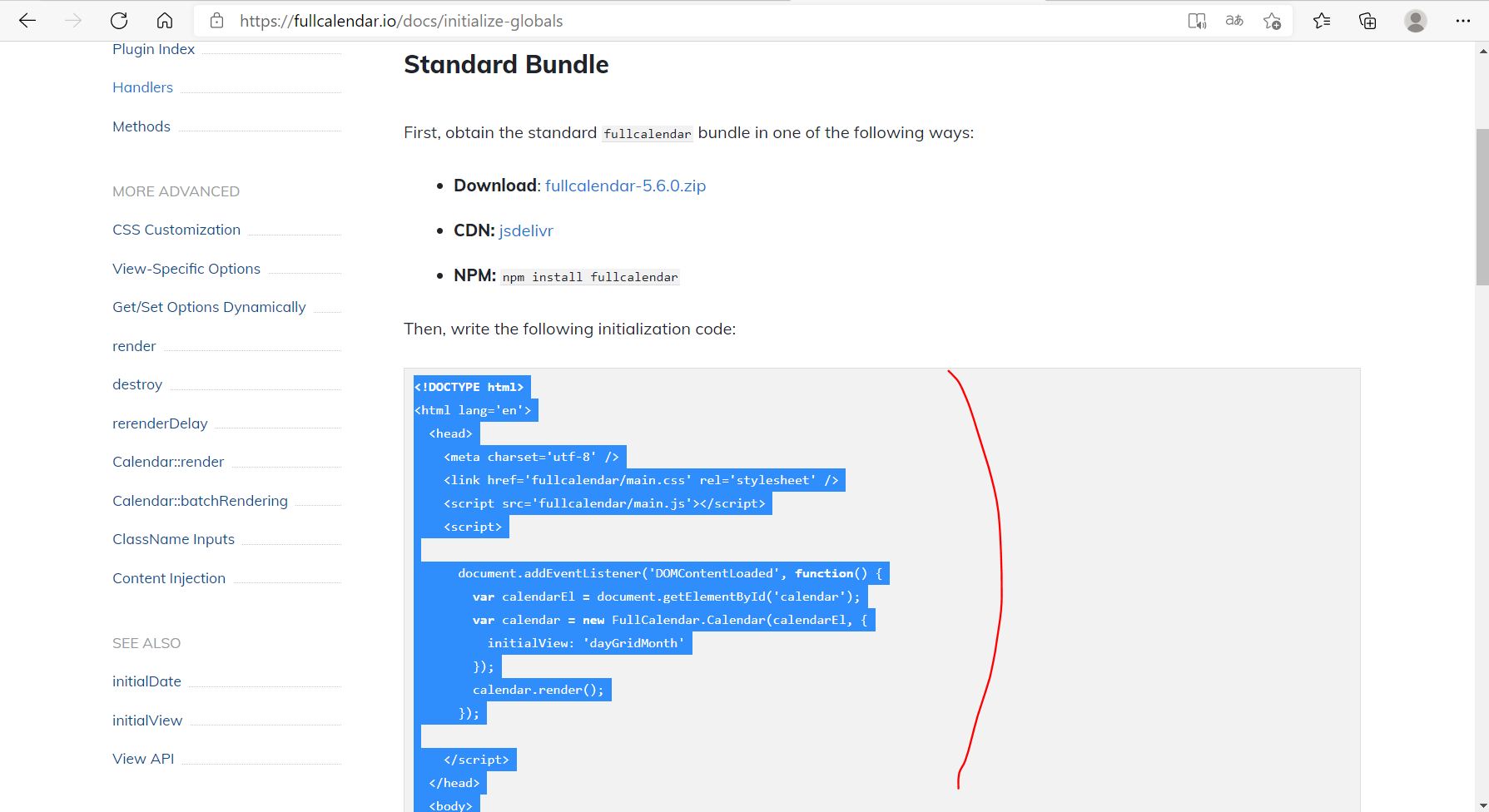 이 페이지의 getting started로 들어가 스크립트를 복사해와서 미리 만들어둔 calendar.html에 담아준다.