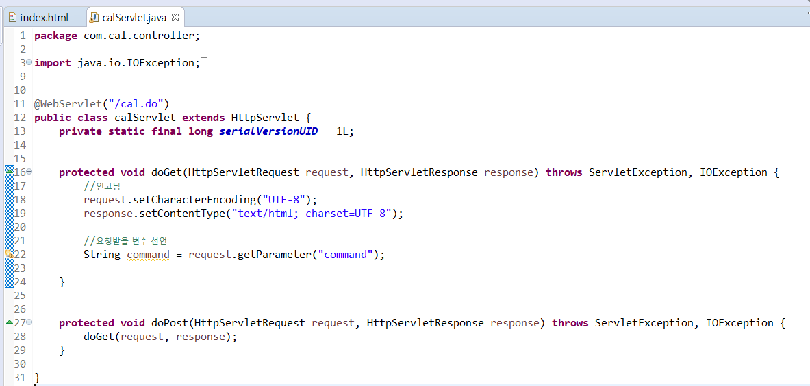 만든 서블릿에 인코딩 처리와 요청받을 변수 선언도 해준다.