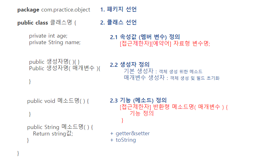 속성 (멤버변수)는 주로 private 으로 선언되어 외부로부터 데이터 변질을 막는다.