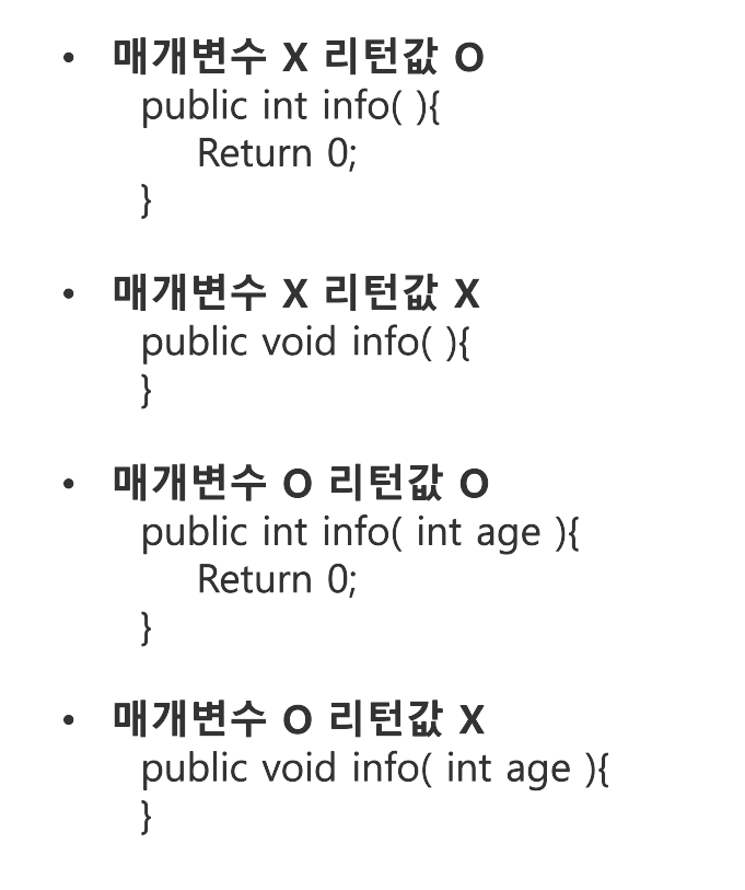 메소드의 표현식은 매개변수 유무와 리턴값 유무에 따라 달라진다.