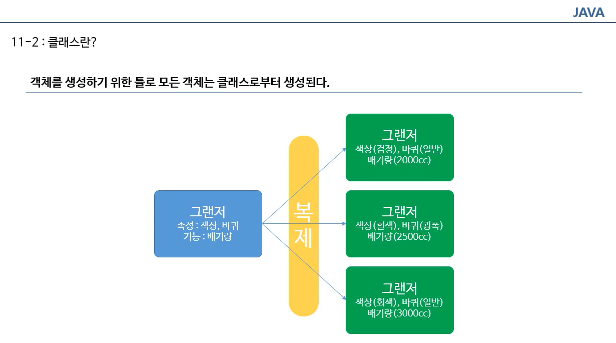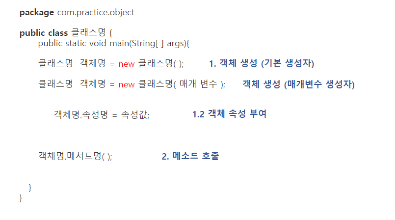 클래스의 정의대로 객체가 연산자를 통해 메모리 영역에 생성되는 것이다.