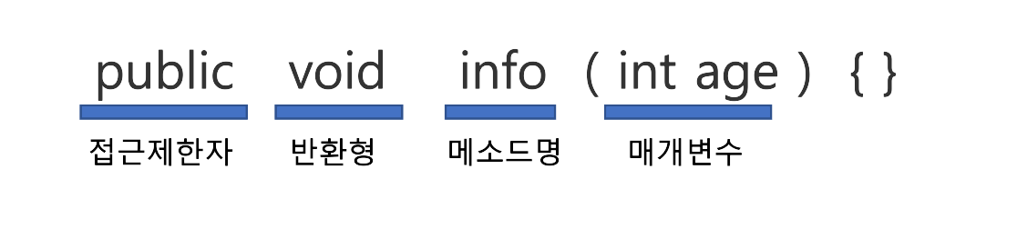 메소드의 선언은 [접근제한자] [반환형] [메소드명] ( 매개변수 ) { } 로 이루어진다.