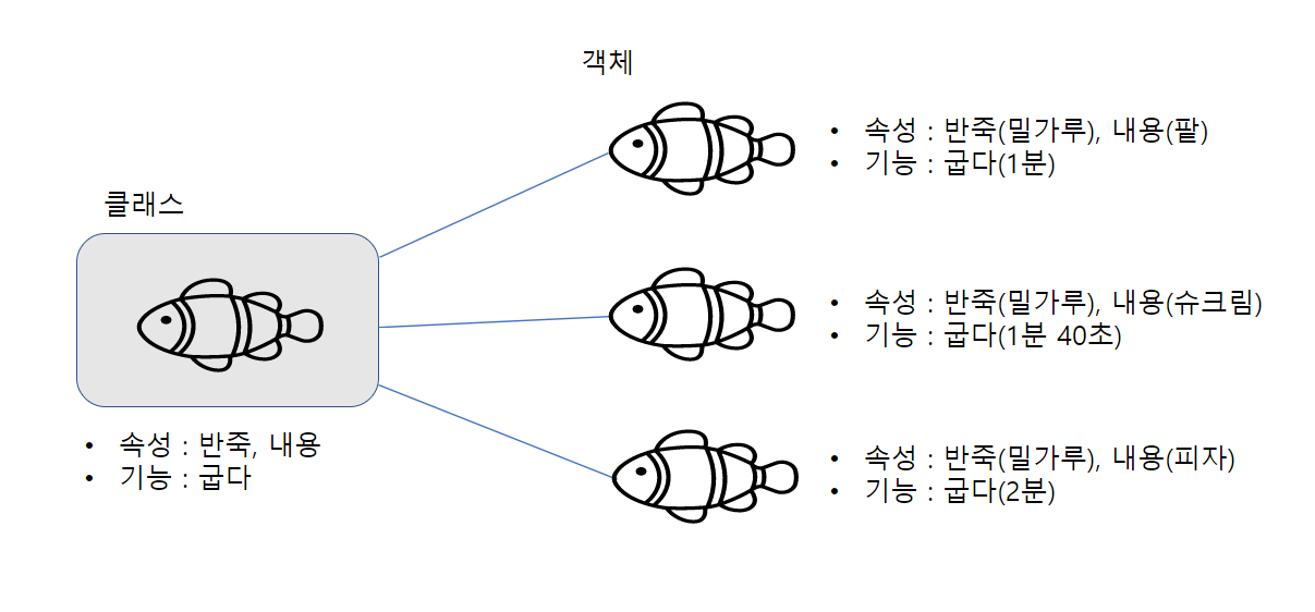 클래스와 객체의 개념이 헷갈릴 수 있다. 이렇게 붕어빵틀과 붕어빵들로 생각하면 이해하기 쉽다.