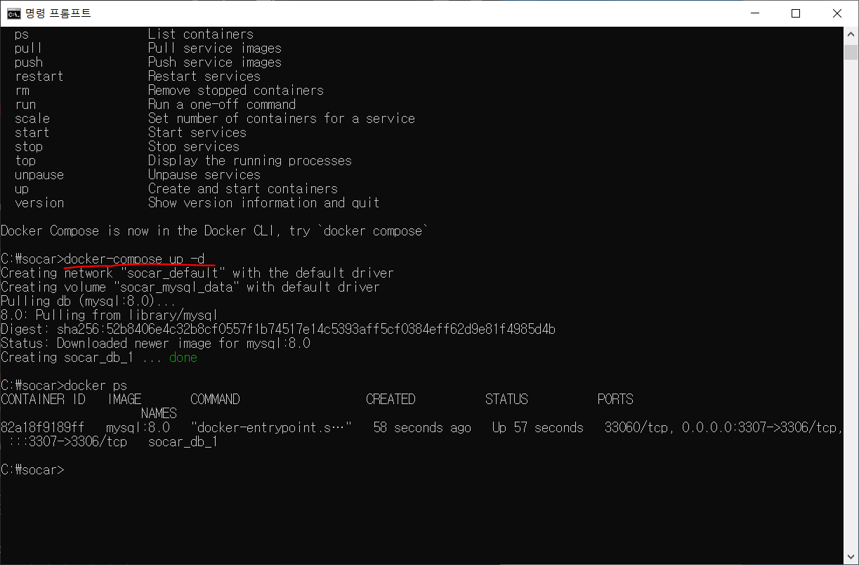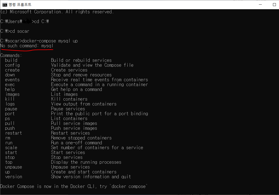 원하는 위치에서 docker-compose mysql up 명령해줬는데 mysql 명령이 없다고 한다.