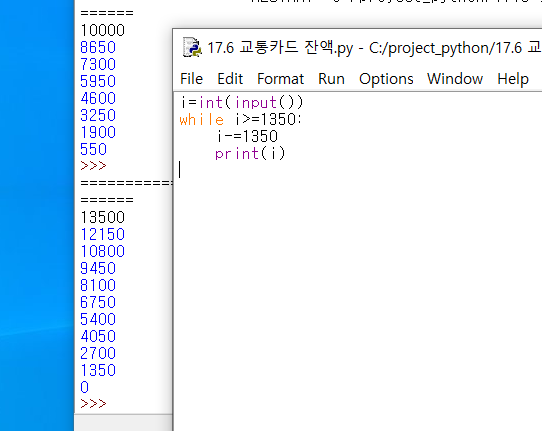 표준입력으로 금액(정수)이 입력됩니다. 1회당 요금은 1350원이고, 교통카드를 사용했을 때마다의 잔액을 각 줄에 출력하는 프로그램을 만드세요. 단, 최초 금액은 출력하지 않아야 합니다. 그리고 잔액은 음수가 될 수 없으며 잔액이 부족하며 출력을 끝냅니다.