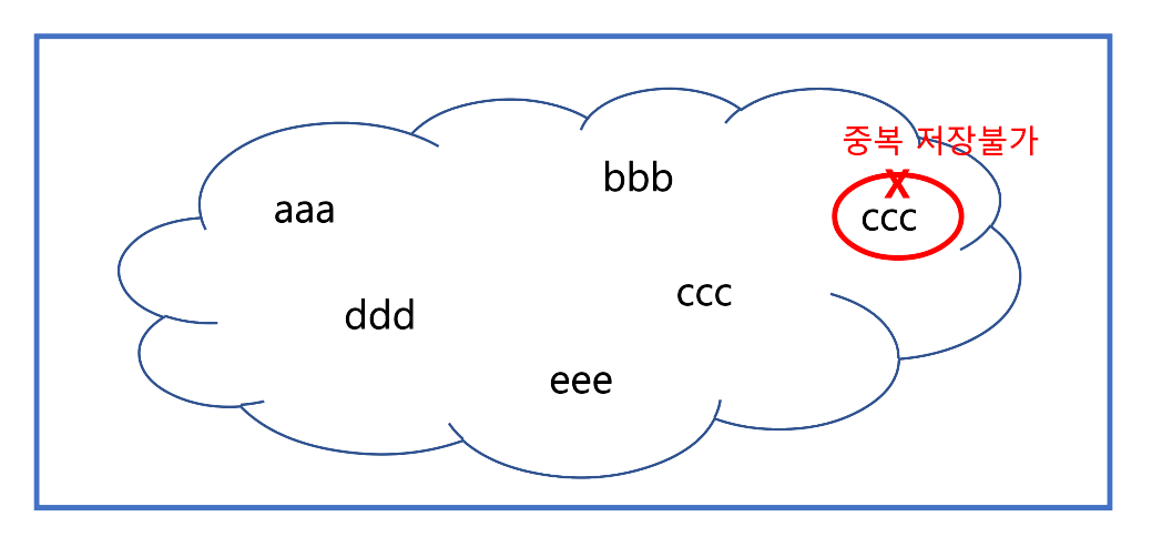 set은 집합처럼 인덱스 저장에 순서(인덱스)가 없다. 중복 저장이 안되는 것이 특징이다.