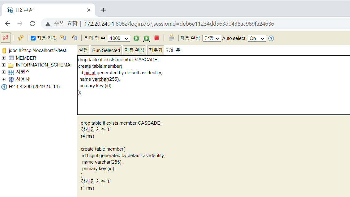 id와 name 컬럼으로 구성된 member테이블을 생성해줬다.