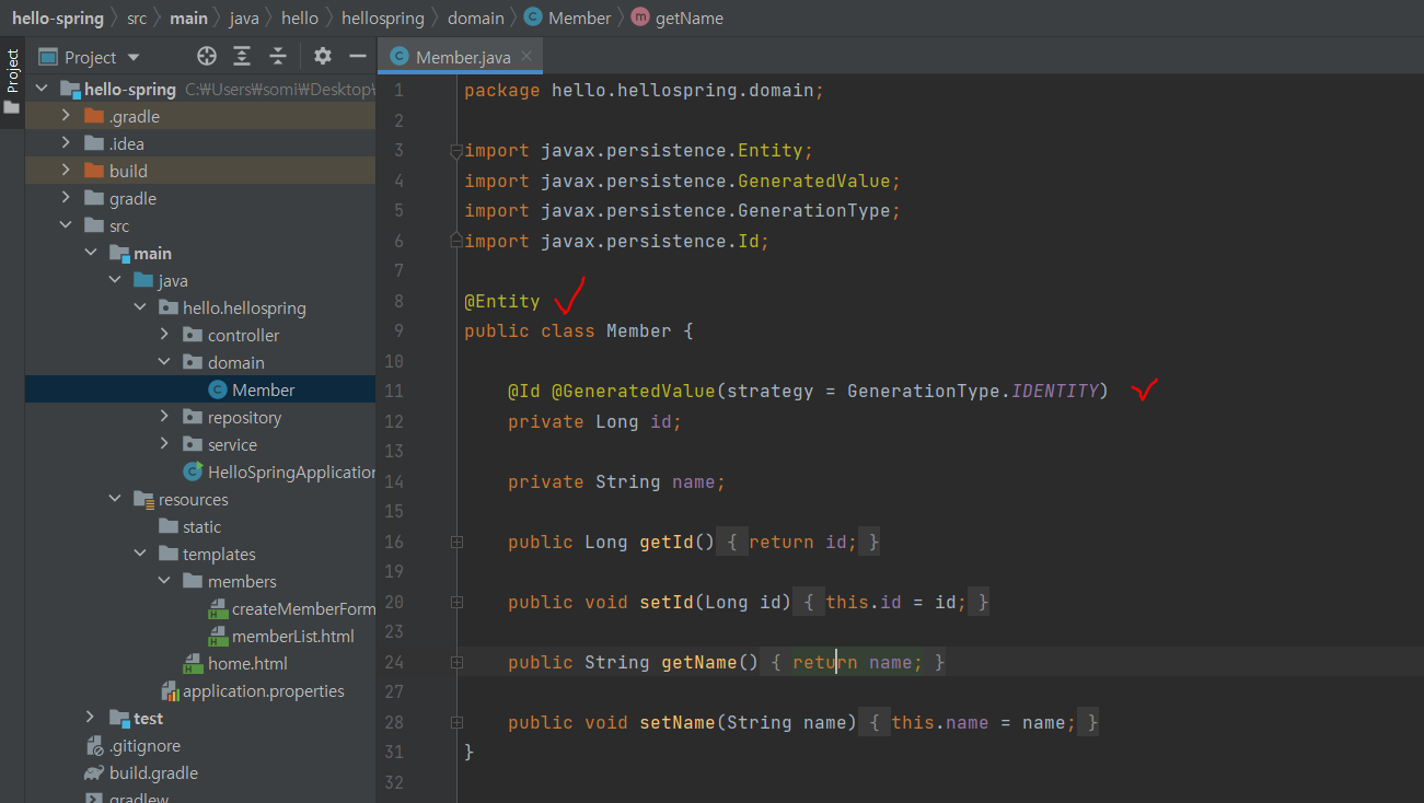@GeneratedValue : 테이블 생성시 추가했던 id bigint generated by default as identity, 조건은 자동으로 id값이 생성되고 증가된다는 것이다. 이를 id에서 선언해준다.