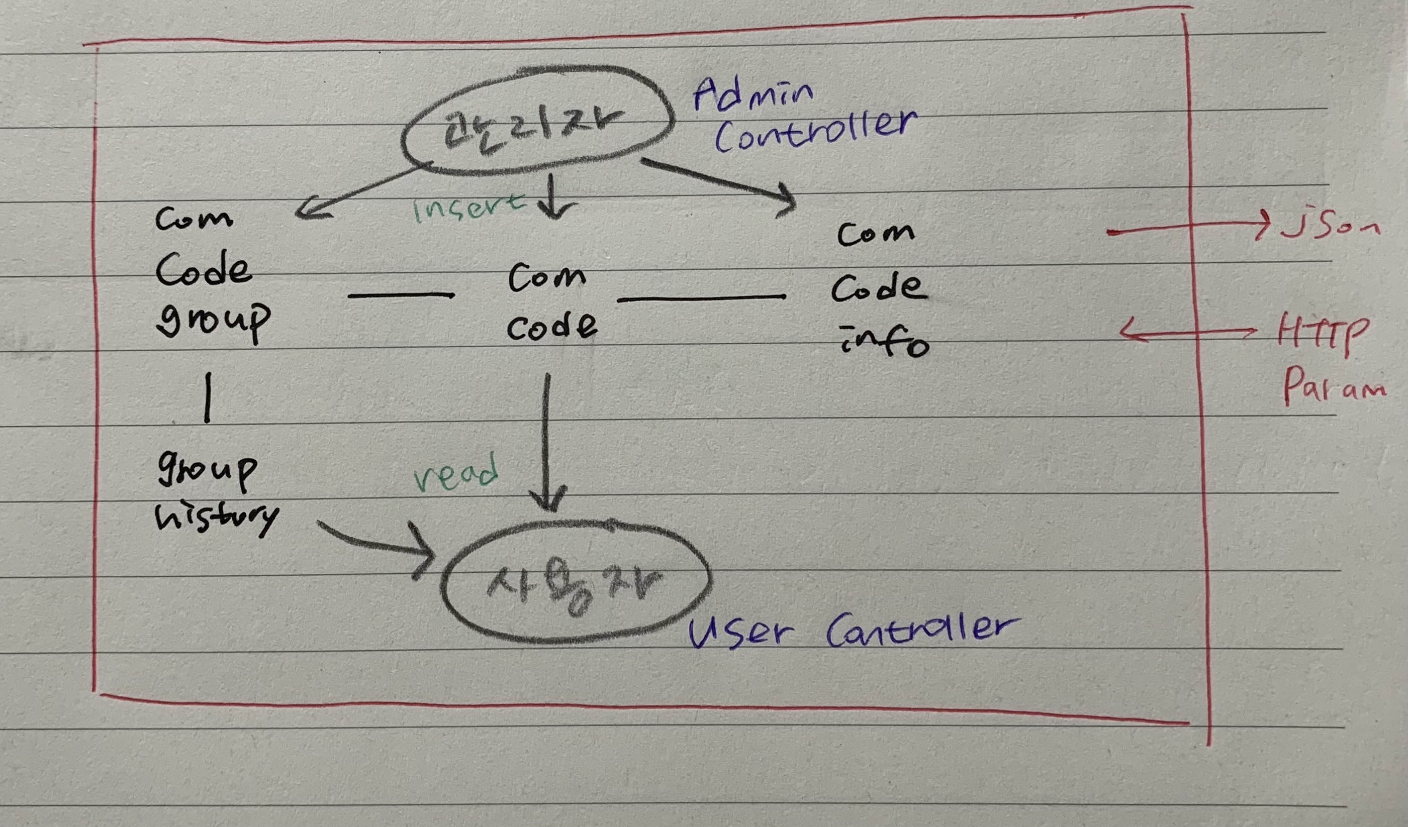 코드 테이블에는 모든 코드가 들어가 있고 이 코드 테이블을 그룹짓는 코드 그룹 카테고리가 있다.