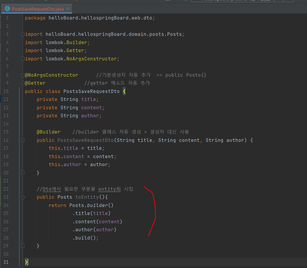 이 dto가 저장될 때 entity로 변환되어 저장되어야 하기 때문에 toEntity 메소드도 만들어줬다.