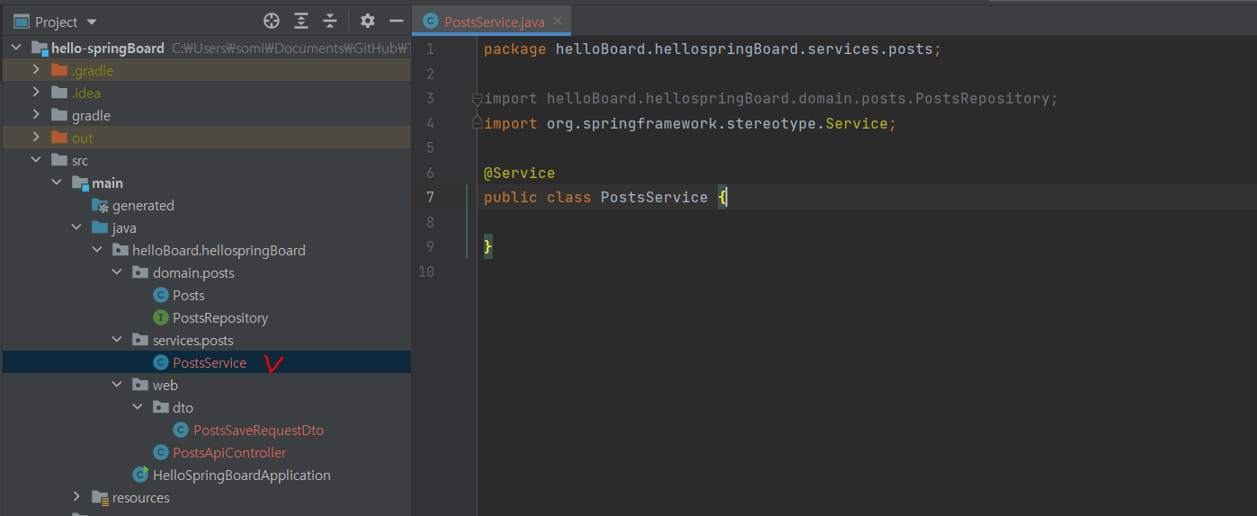 service 패키지 생성 > posts 패키지 생성 > PostsService.java 생성