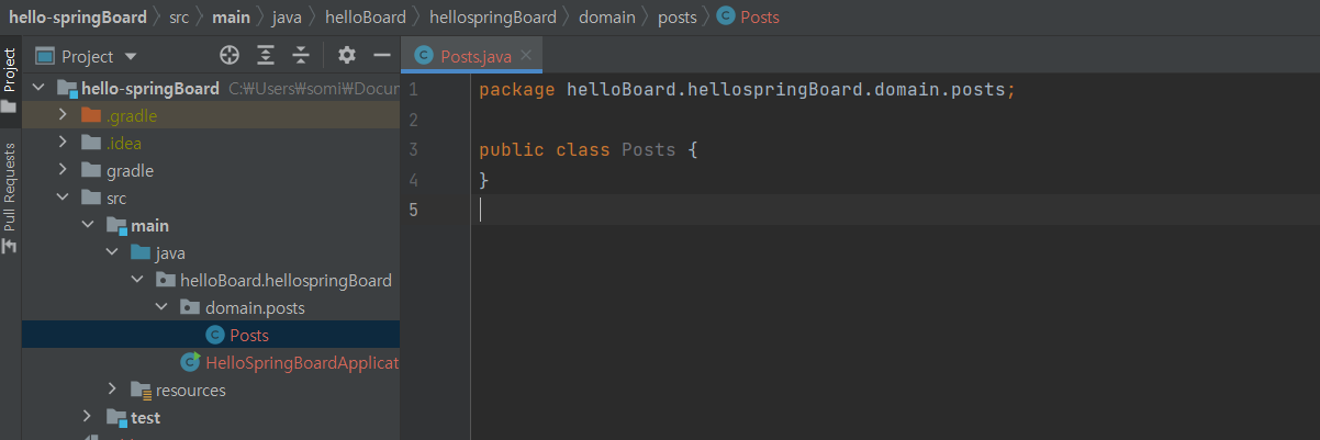 domain 패키지 생성 > posts 패키지 생성 > Posts 클래스 생성