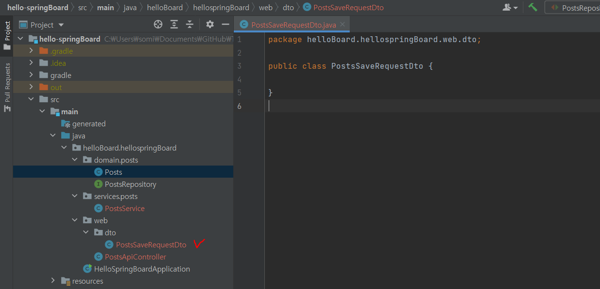 web 패키지 생성 > dto 패키지 생성 >PostsSaveRequestDto.java 클래스 생성