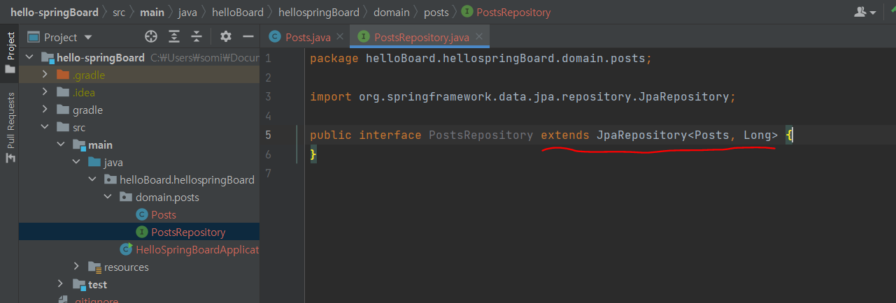 같은 domain 패키지 > posts 패키지에 PostsRepository를 생성해줬다.
