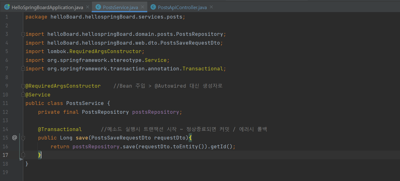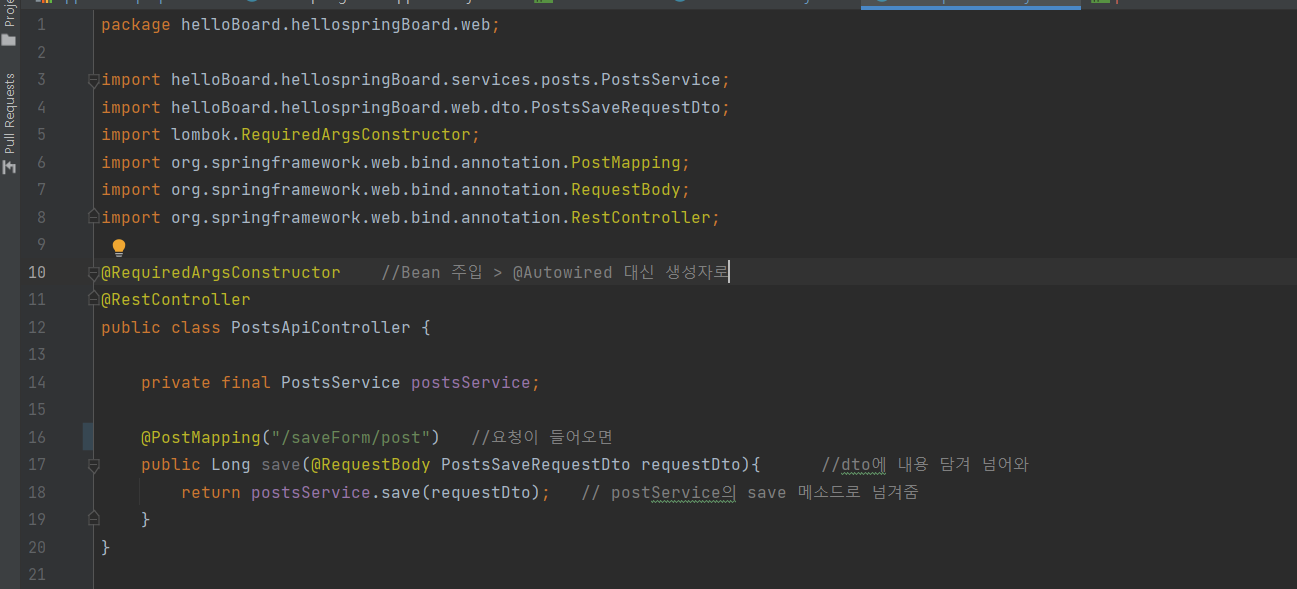 @RestController선언을 해주고 PostService를 가져와 save 메소드를 완성하기 위해 bean을 주입받는다.