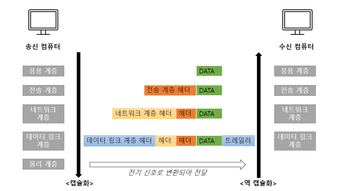 송신하는 컴퓨터의 응용계층부터 시작해 물리계층까지 오며 데이터에 필요한 정보를 헤더에 붙여붙여 넘긴다.