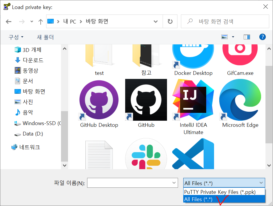 여기서 중요한 건 기본적으로 설정된 파일 형식 ppk가 아닌 All Files로 선택해야 내 키페어가 나온다.