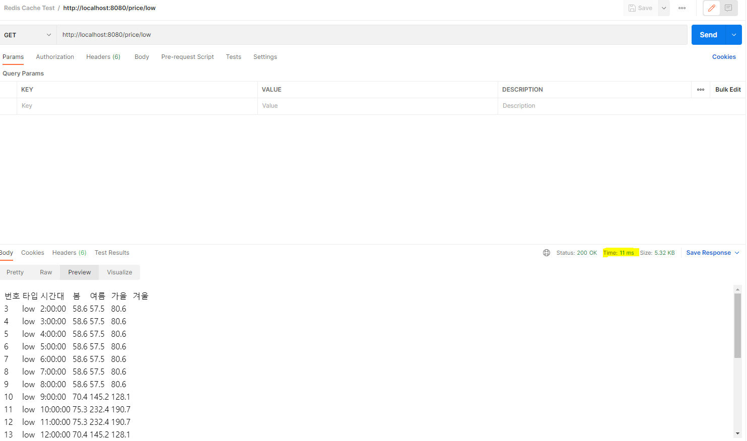 오래걸린 것도 아니지만 다시 요청해보니 11 ms로 줄었다.